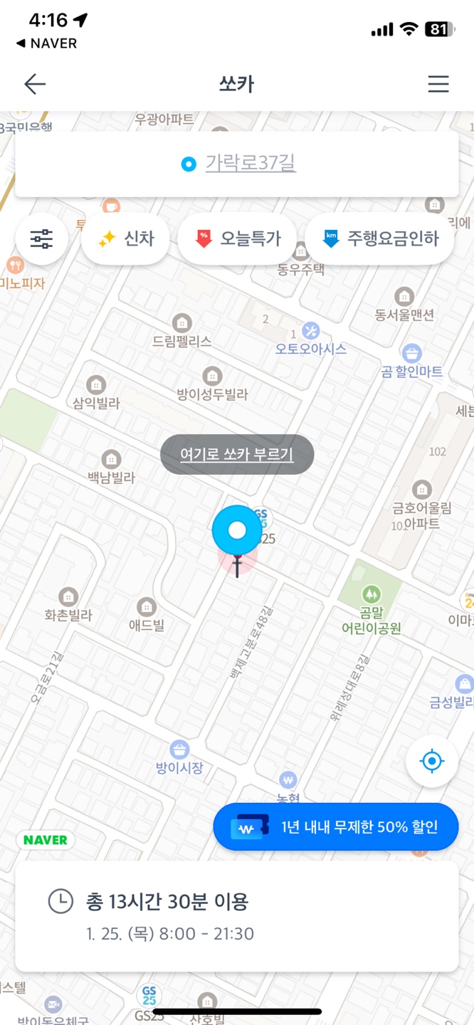 여기로 부르기는 이렇게 가격이 나왔는데, 가까운 곳에 쏘카 가지러갈 장소가 있어서 확인해보니 집에서 10분 내 거리에 꾀 여러곳이 있었습니다. 가격차이가 가지러 가기가 훨씬 저렴했습니다.